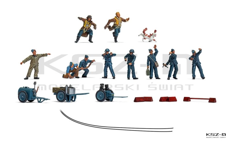 - Zestaw zawiera: 8 figurek personelu naziemnego, 2 figurki pilotów, wózek akumulatorowy, wózek amunicyjny, beczkę olejową, klin pod koło i dodatkowe akcesoria