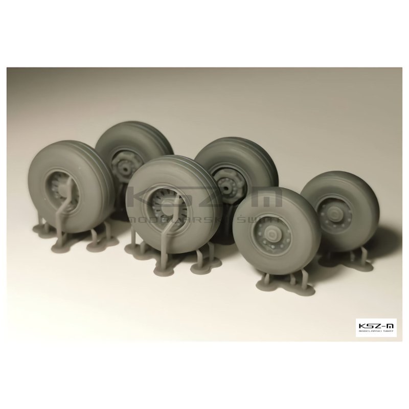 Komplet kół żywicznych do modelu samolotu Casa C-295M. Zestaw zawiera 6 kół.