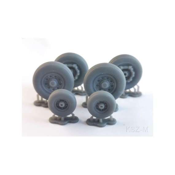 Komplet kół żywicznych do modelu samolotu Mirage F1CZ. Zestaw zawiera 6 kół.