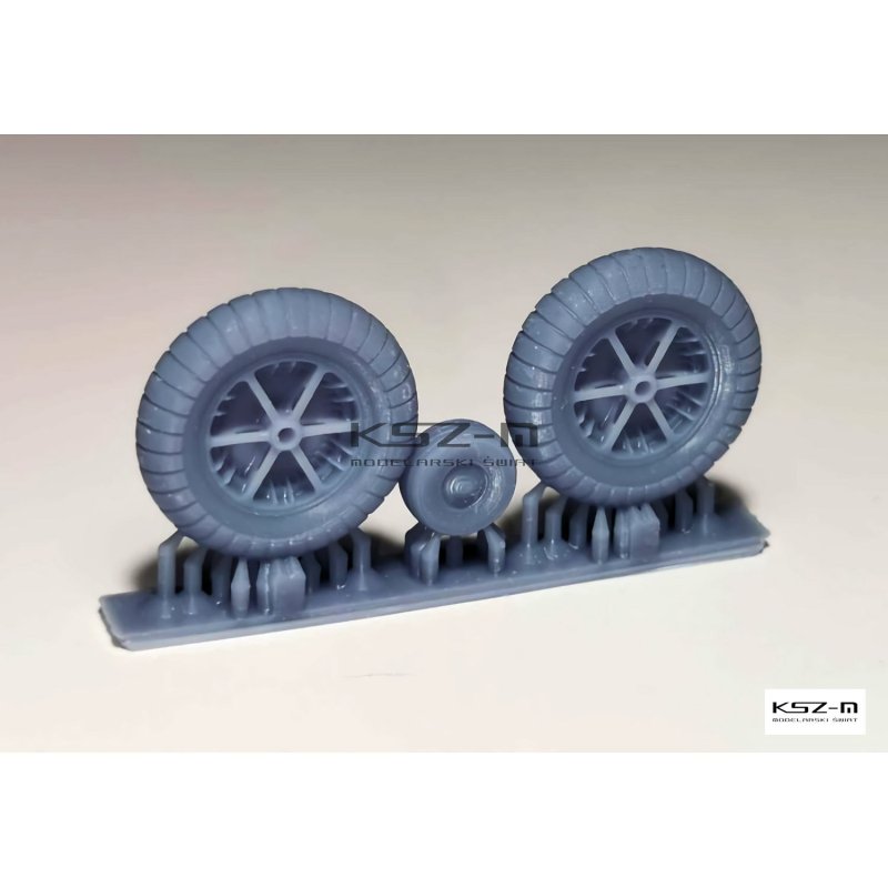 Zestaw kół wykonanych z żywicy metodą druku 3D przeznaczony do modeli kartonowych Messerschmitt Bf-109 w skali 1:33 z wydawnictwa MPModel. Elementy odwzorowują wczesny typ wąskich kół podwozia głównego stosowanych w wersjach B–G-2. Zastosowanie gotowych kół żywicznych pozwala uzyskać realistyczny profil opony, detale piasty oraz napisy eksploatacyjne. Zestaw jest dedykowany do modeli MPModel, lecz odpowiada także wczesnemu typowi podwozia stosowanemu w modelach innych wydawnictw.