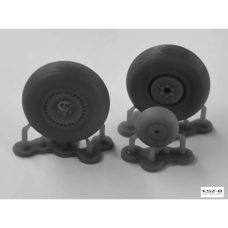 Komplet kół żywicznych do modelu samolotu Jak-9W. Zestaw zawiera 3 koła.