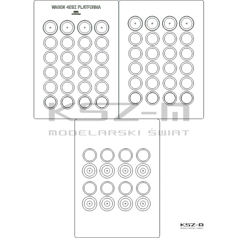 Zestaw kół wycinanych laserowo przeznaczony do modelu kartonowego wagonu platformy 426Z w skali 1:25 z wydawnictwa Angraf (nr 143). Elementy wykonane z tektury modelarskiej zapewniają wysoką precyzję oraz powtarzalność, co pozwala uzyskać lepszy efekt końcowy niż w przypadku ręcznego wycinania.