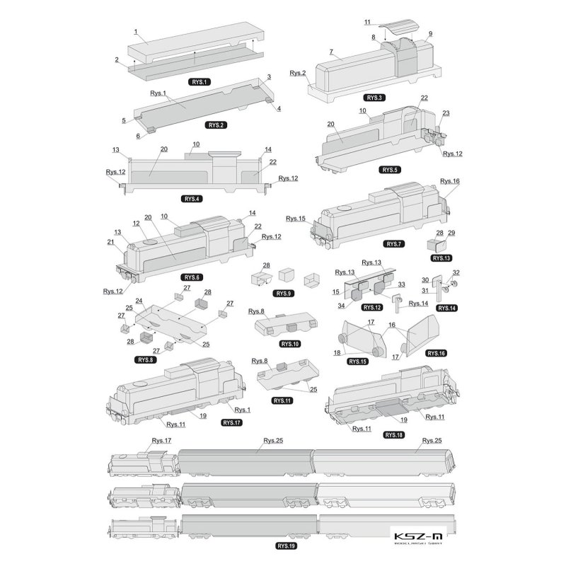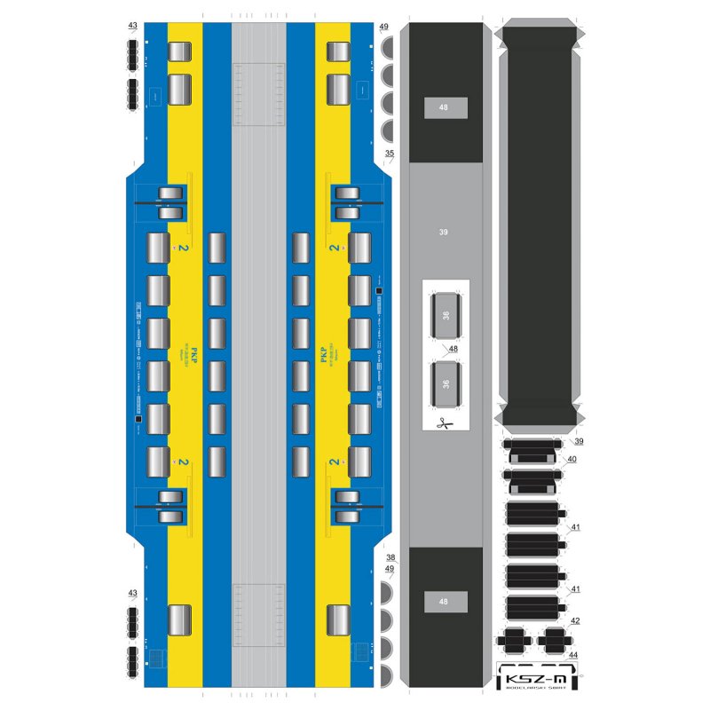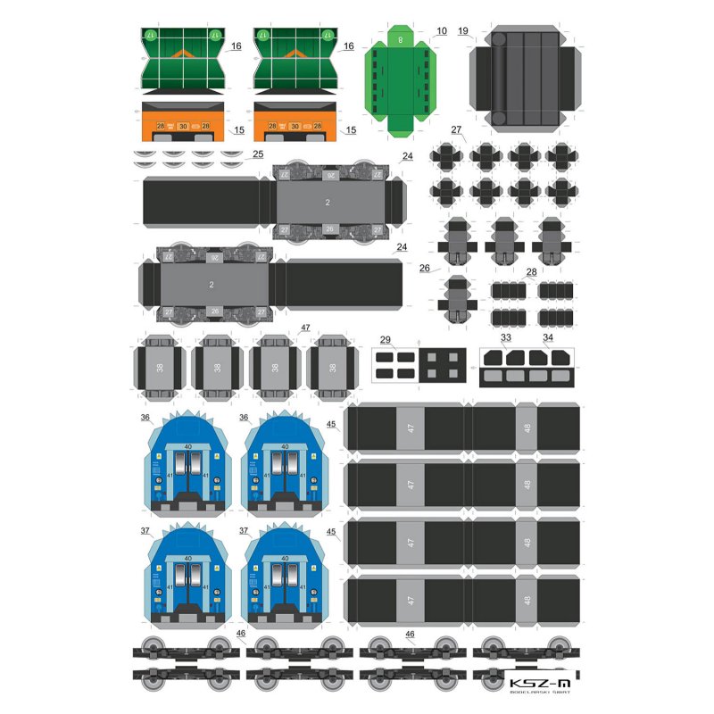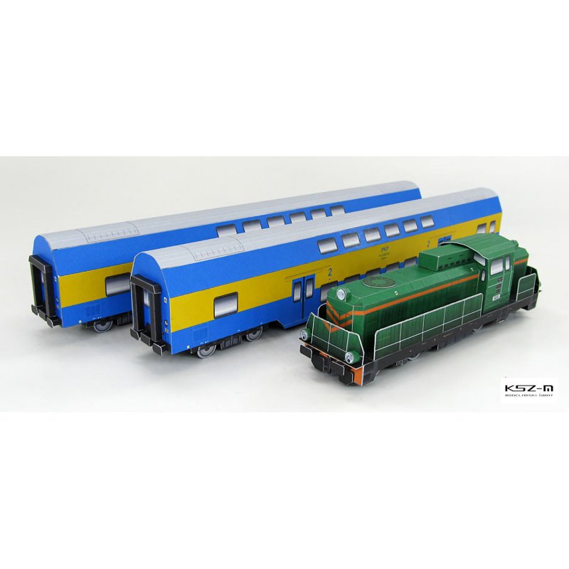 Wycinanka zawiera: model lokomotywy manewrowej SM42 oraz dwa wagony piętrowe pasażerskie typu Bdhpumn