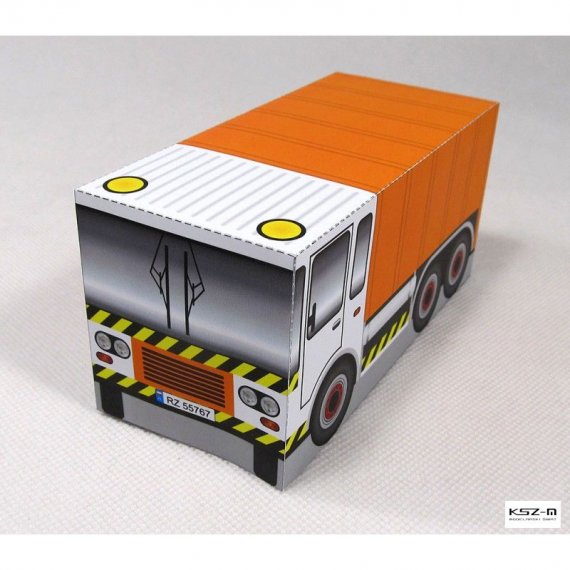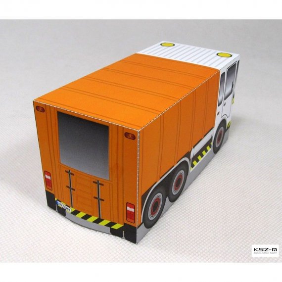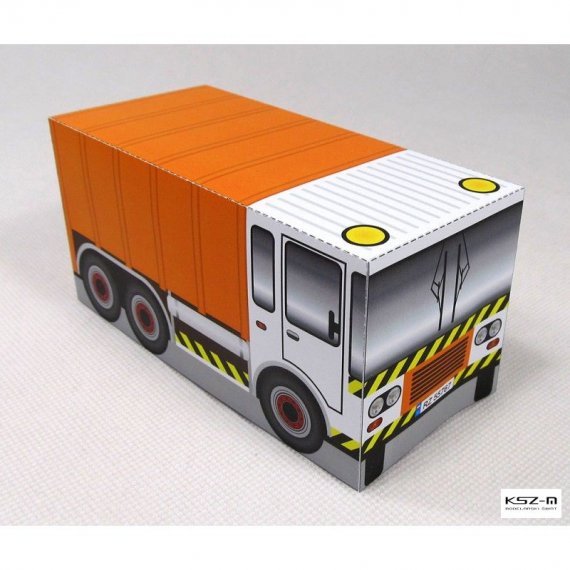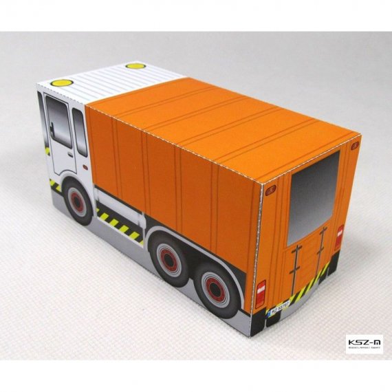 Prosty model śmieciarki przeznaczony dla początkujących modelarzy, a w szczególności dla dzieci przedszkolnych, które samodzielnie będą w stanie wyciąć i skleić model.