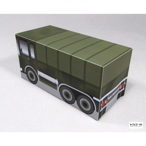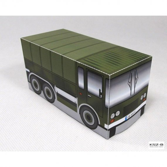 Prosty model ciężarówki wojskowej przeznaczony dla początkujących modelarzy, a w szczególności dla dzieci przedszkolnych, które samodzielnie będą w stanie wyciąć i skleić model.
