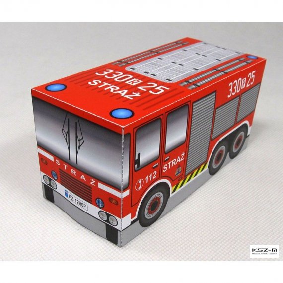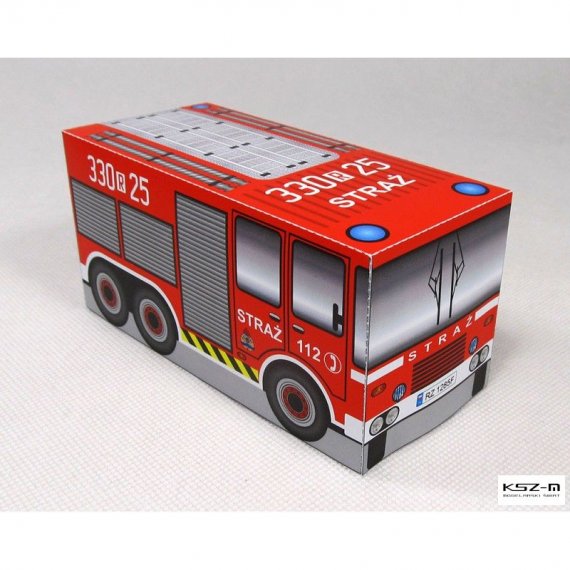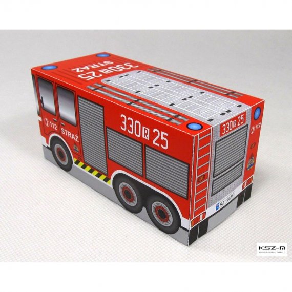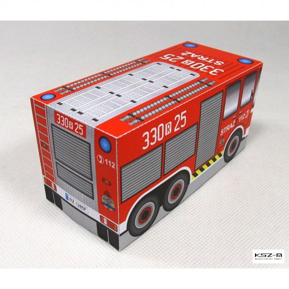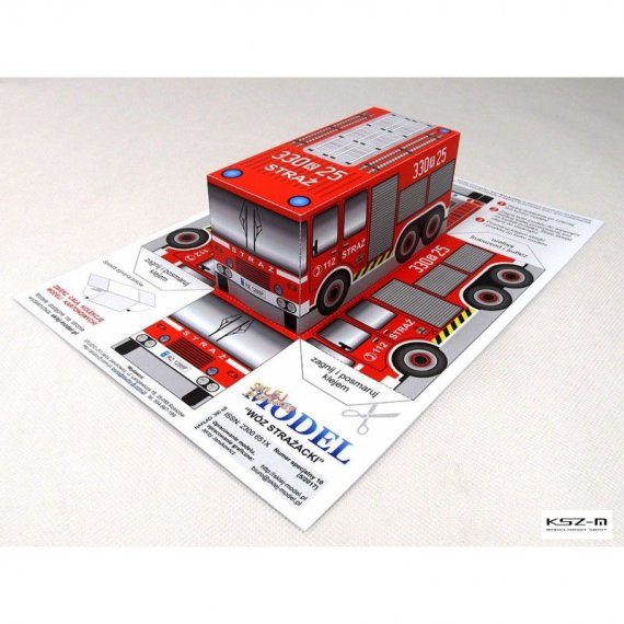 Prosty model wozu strażackiego przeznaczony dla początkujących modelarzy, a w szczególności dla dzieci przedszkolnych, które samodzielnie będą w stanie wyciąć i skleić model.