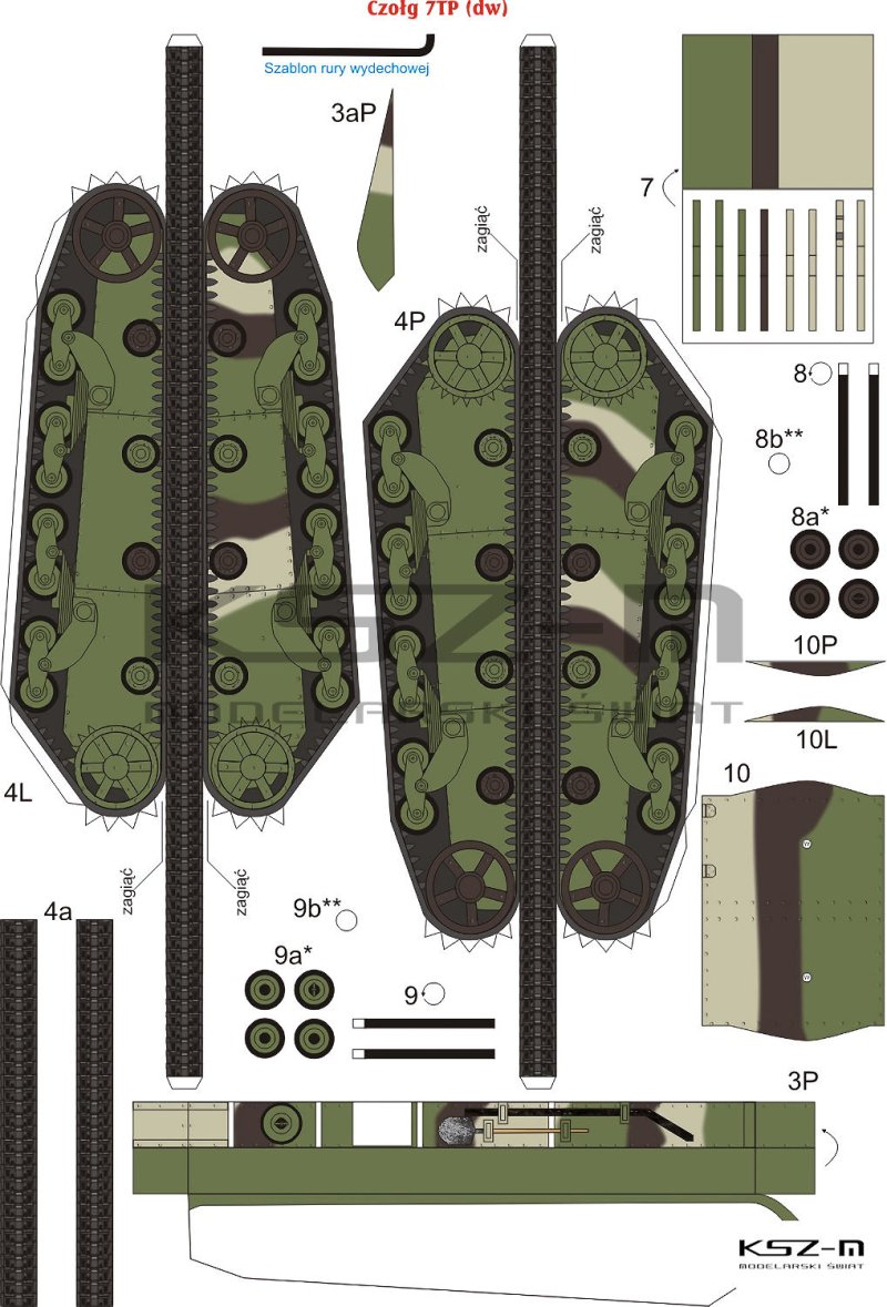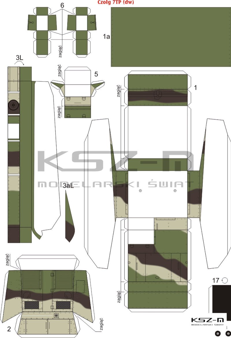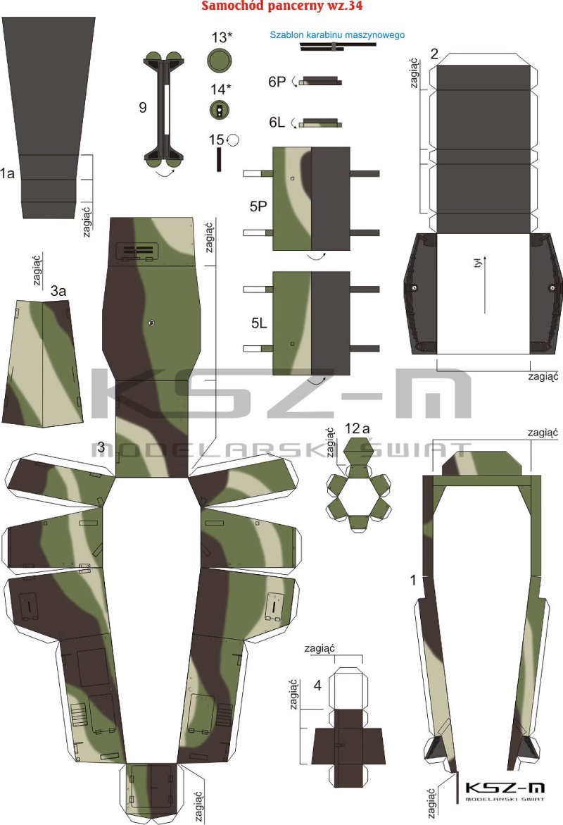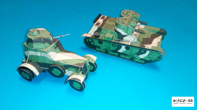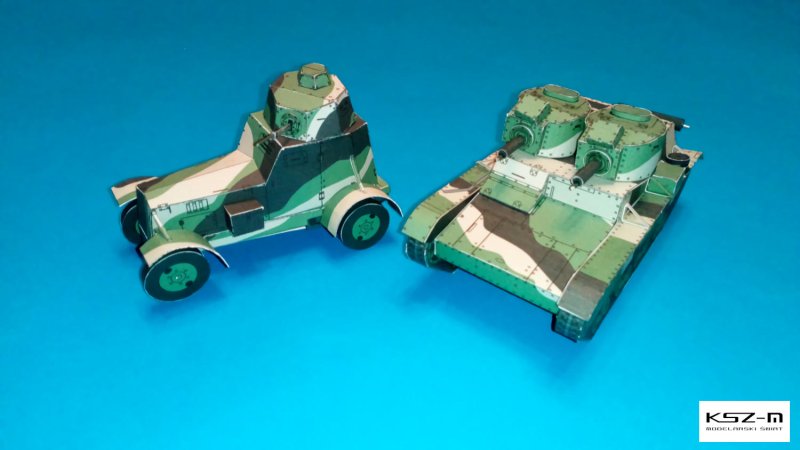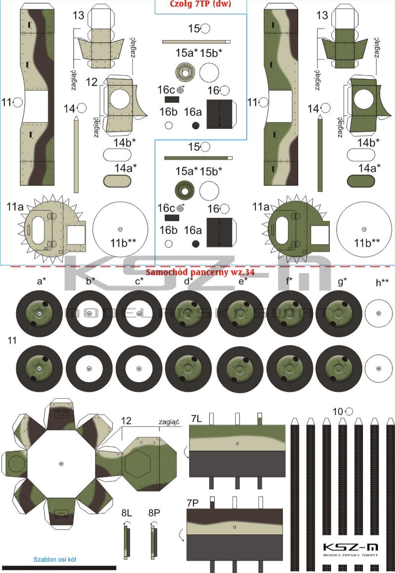 Model przedstawia polski samochód pancerny wz.34 oraz polski czołg lekki 7TP w wersji dwuwieżowej (dw), używane przez Wojsko Polskie w okresie międzywojennym i podczas kampanii 1939 roku. Opracowanie umożliwia wykonanie dwóch charakterystycznych pojazdów pancernych polskiej armii w kamuflażu z końca lat 30. XX wieku. Zestaw ma prostą konstrukcję i jest przeznaczony przede wszystkim dla początkujących modelarzy oraz młodszych miłośników modelarstwa kartonowego. Modele po złożeniu dobrze oddają sylwetki oryginalnych pojazdów i mogą stanowić ciekawy element kolekcji sprzętu Wojska Polskiego z okresu II wojny światowej.