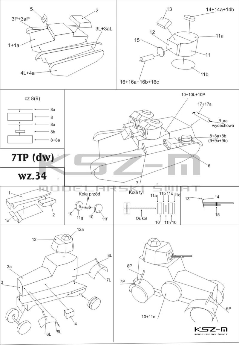 - Zestaw pozwala wykonać dwa modele: samochód pancerny wz.34 oraz czołg 7TP (dw)