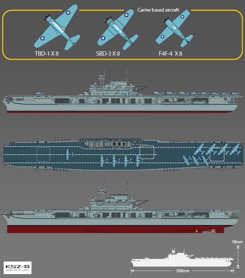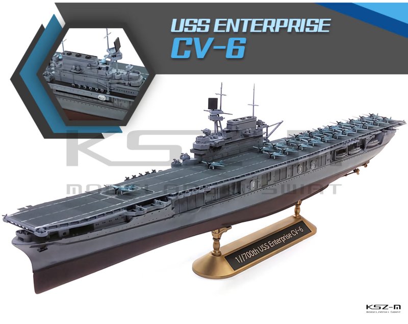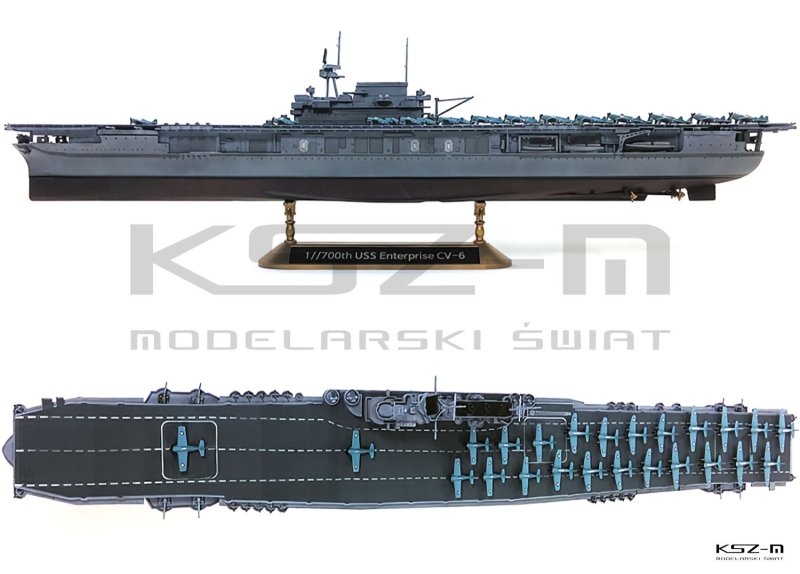 Model USS Enterprise CV-6 to szczegółowy plastikowy zestaw w skali 1:700 przedstawiający legendarny amerykański lotniskowiec uczestniczący w Bitwie o Midway w 1942 roku. Zestaw umożliwia montaż w wersji z pełnym kadłubem lub w wariancie waterline (linia wodna), zawiera 24 samoloty (8 × F4F-4 Wildcat, 8 × SBD-3 Dauntless, 8 × TBD-1 Devastator), kalkomanie z oznaczeniami z okresu Midway oraz stabilną podstawę ekspozycyjną. Model charakteryzuje się wysokim poziomem detali pokładu i nadbudówki oraz bogatym zestawem drobnych elementów. Doskonały dla pasjonatów dioram i modelarzy zainteresowanych tematyką II wojny światowej, szczególnie polecany osobom średniozaawansowanym i zaawansowanym ze względu na wymaganą precyzję montażu.