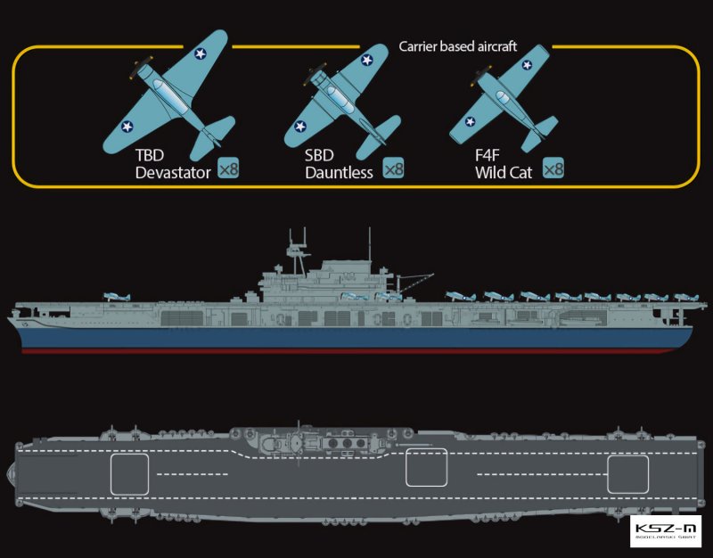 USS Yorktown (CV-5) był jednym z trzech lotniskowców klasy Yorktown, zbudowanym dla US Navy pod koniec lat 30. XX wieku. W czerwcu 1942 roku odegrał kluczową rolę w bitwie o Midway, będącej punktem zwrotnym wojny na Pacyfiku. Pomimo poważnych uszkodzeń odniesionych kilka tygodni wcześniej podczas bitwy na Morzu Koralowym, został prowizorycznie naprawiony i wzięty do udziału w Midway. W trakcie walk został trafiony torpedami przez japońskie okręty podwodne i zatonął 7 czerwca 1942 roku. Yorktown był uzbrojony m.in. w działa przeciwlotnicze i dysponował grupą lotniczą składającą się z myśliwców F4F Wildcat, bombowców nurkujących SBD Dauntless i torpedowców TBD Devastator. Jego udział w zniszczeniu czterech japońskich lotniskowców miał kluczowe znaczenie dla przewagi USA w dalszej fazie wojny.