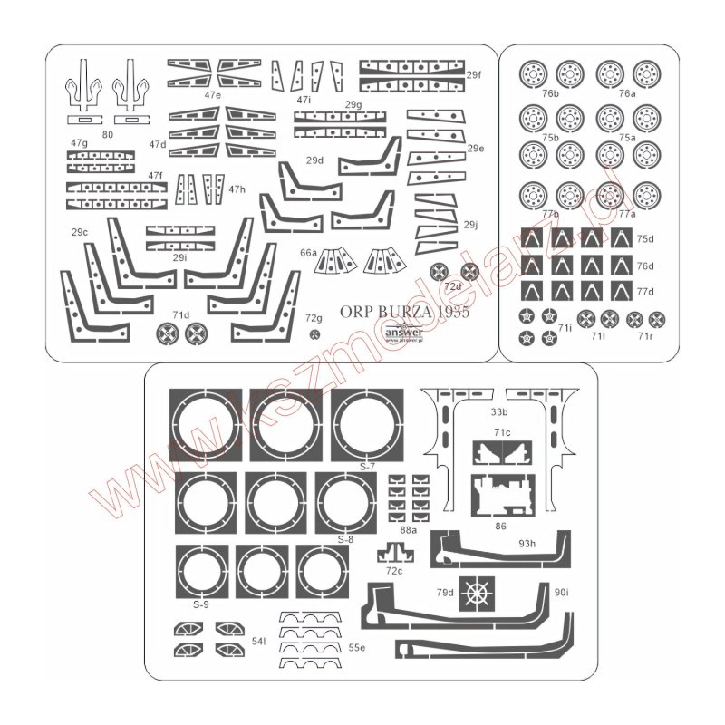 Zestaw detali wyciętych laserem do modelu ORP Burza (1935) z wydawnictwa Answer nr 570, skala 1:200