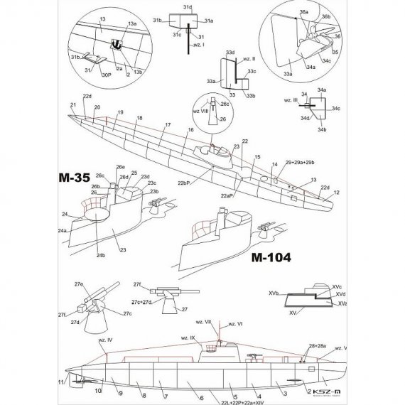 Dwa modele sowieckich okrętów podwodnych z II WŚ. M-35 i M-104 należały do typu M (seria XII) i służyły do 1953. Model mały i w miarę prosty, choć wymagający uwagi przy sklejaniu.