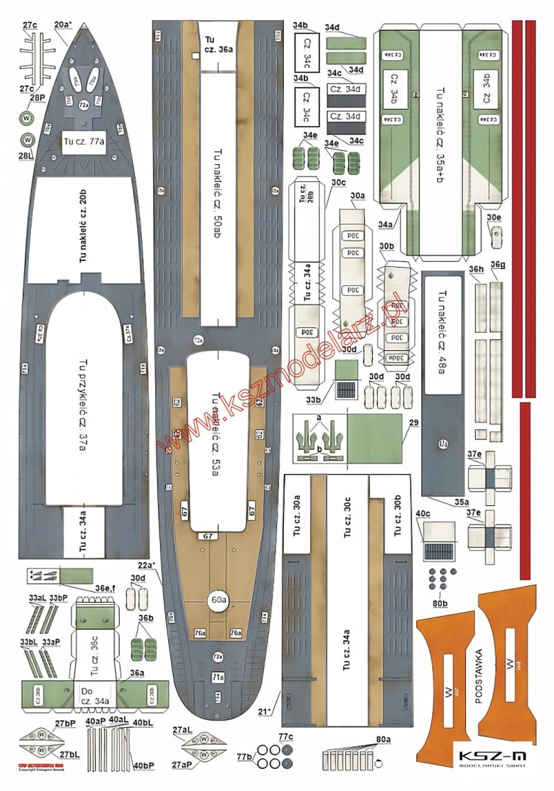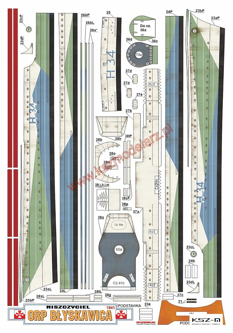 Model kartonowy ORP Błyskawica w skali 1:200, wydany przez Answer, przedstawia okręt w konfiguracji z 1941 roku. Zestaw zawiera kolorowe arkusze z precyzyjnie nadrukowanymi elementami oraz szczegółową instrukcję montażu. Model pozwala na odwzorowanie charakterystycznych linii okrętu, w tym detali nadbudówek, uzbrojenia i wyposażenia pokładowego. Dodatkowo, dostępne są opcjonalne akcesoria, takie jak laserowo wycinane elementy szkieletu i detali, które ułatwiają montaż i zwiększają realizm modelu. Po złożeniu, model stanowi efektowną replikę jednego z najbardziej rozpoznawalnych polskich okrętów wojennych, idealną do ekspozycji w kolekcji modeli morskich.