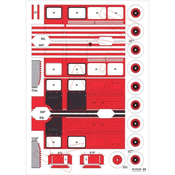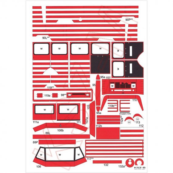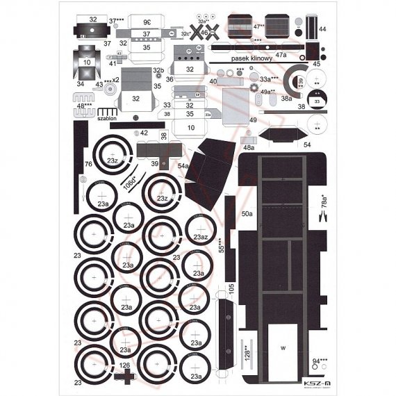 - zestaw wycinany laserowo: szkielet (wręgi), koła, grawerowane bieżniki opon, detale
