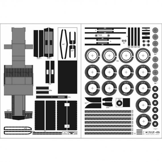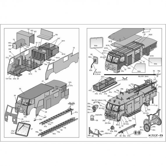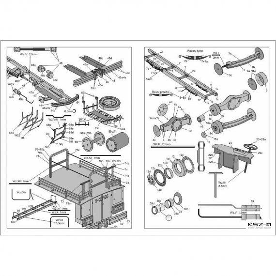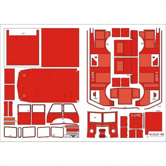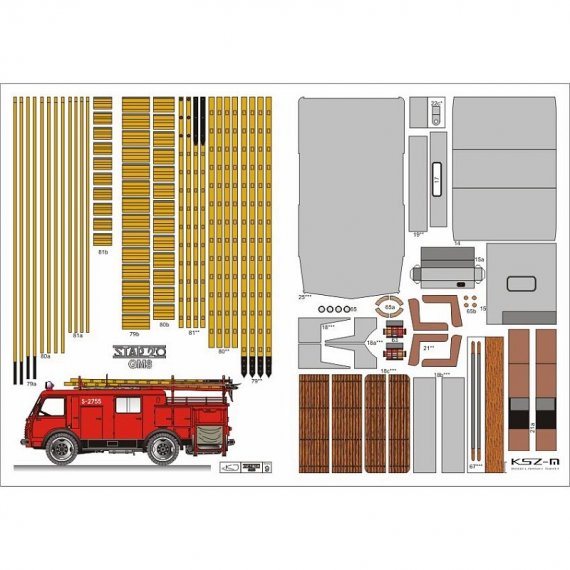 - szkielet (wręgi), koła, bieżniki opon, drabina, grawerowane tablice rejestracyjne wycinane laserowo