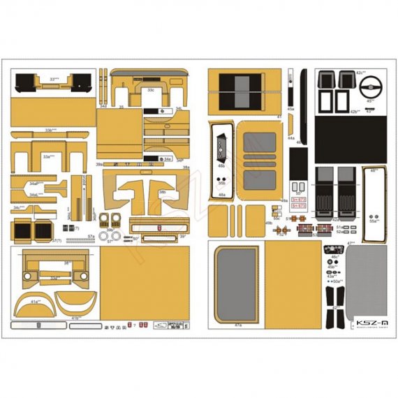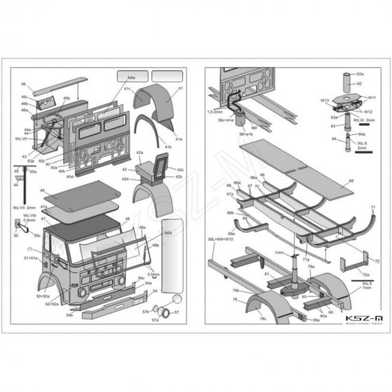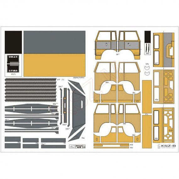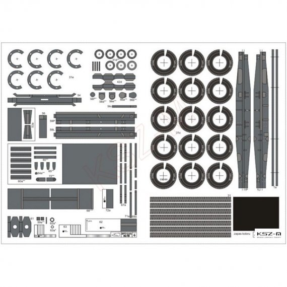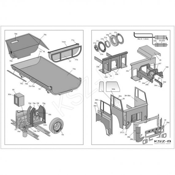 - zestaw wycinany laserowo: wręgi, koła, bieżniki opon, detale, grawerowane tablice rejestracyjne.