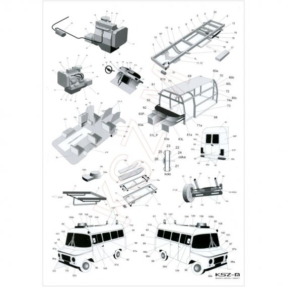 - zestaw wycinany laserowo: szkielet (wręgi), koła, detale, grawerowana chłodnica
