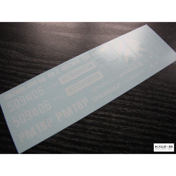 Komplet kalkomanii wodnych (białe litery/znaki na przeźroczystym nośniku) dla modelarzy wykonujących modele waloryzowane i malowane farbami. Poniżej dodatkowo schemat zestawu z zaznaczonym na kolorowo rozkładem przeźroczystego w oryginale lakieru nośnego.