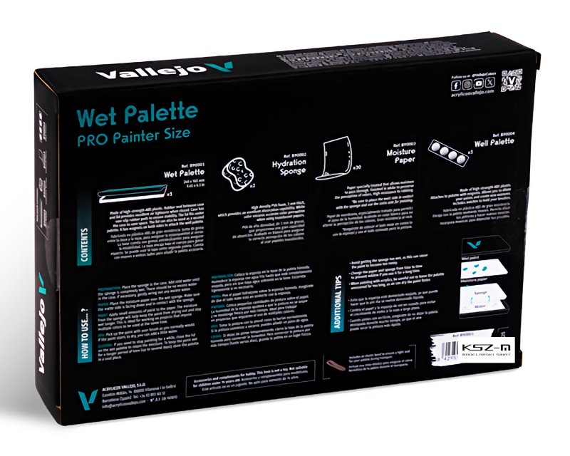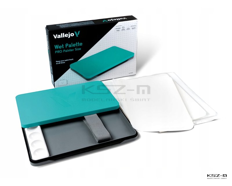 Vallejo B90001 to profesjonalna, przenośna mokra paleta zaprojektowana z myślą o modelarzach i malarzach figurek pracujących z farbami akrylowymi. Jej konstrukcja oparta jest na systemie wilgotnego podłoża, składającego się z gąbki i specjalnego papieru paletowego, który skutecznie zapobiega wysychaniu farby i pozwala na długotrwałe utrzymanie jej właściwej konsystencji. Dzięki temu możliwe jest swobodne i precyzyjne mieszanie kolorów podczas długich sesji malarskich.
