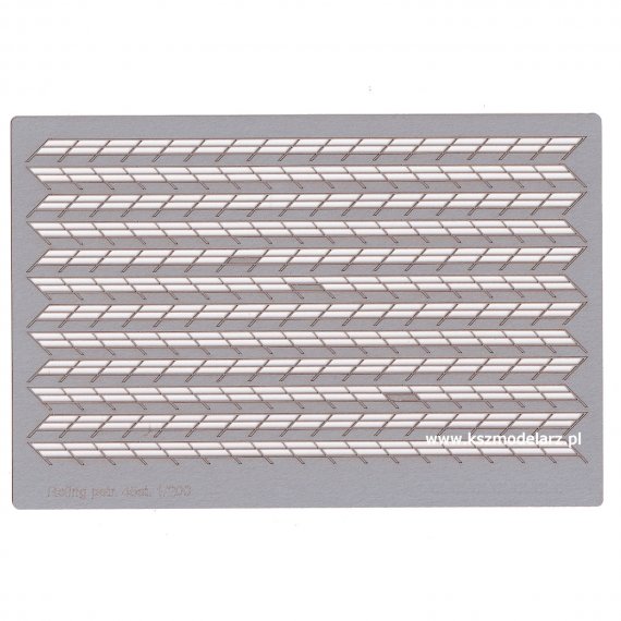 Reling kartonowy wycinany laserem skośny, 45 st., 3-rzędowy w skali 1:200. Łączna długość relingu: 164 cm.