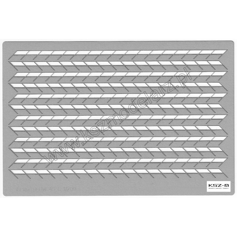 Reling kartonowy wycinany laserem skośny, 45 st., 2-rzędowy w skali 1:200. Łączna długość relingu: 164 cm.