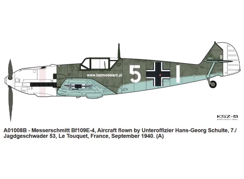 A. Messerschmitt Bf109E-4, Aircraft flown by Unteroffizier Hans-Georg Schulte, 7./Jagdgeschwader 53, Le Touquet, France, September 1940.