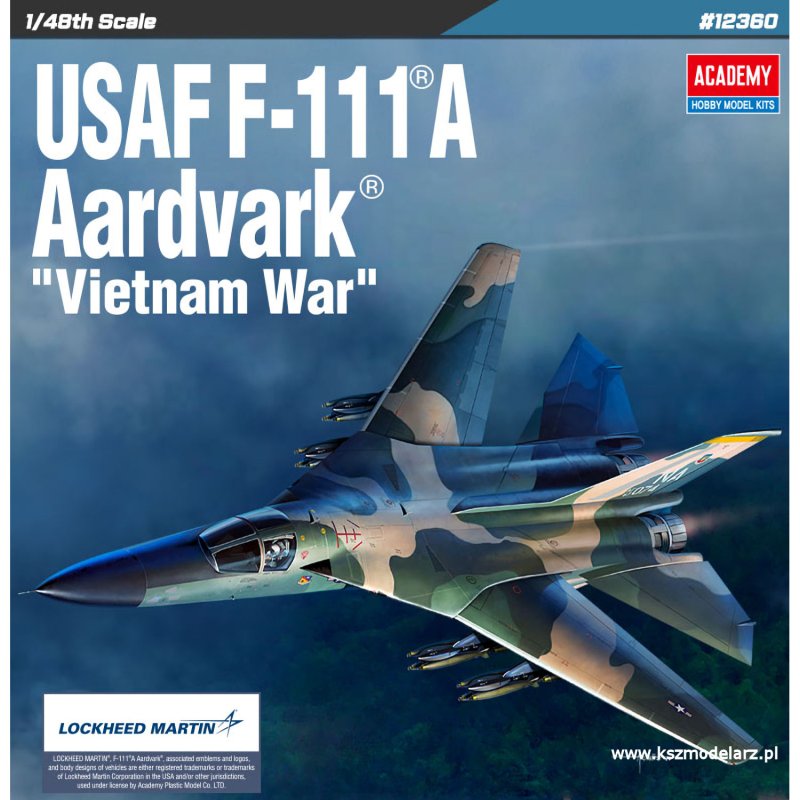 Academy 12360 – USAF F-111A Aardvark "Vietnam War" w skali 1:48 to precyzyjnie odwzorowany zestaw plastikowy, który pozwala na zbudowanie szczegółowej repliki tego legendarnego samolotu. Zestaw zawiera: