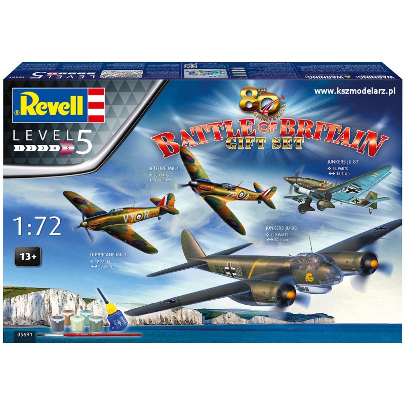 REVELL 05691 - 80th Anniversary Battle of Britain - Zestaw: 4 samoloty (Spitfire Mk.1a, Hurricane Mk.1, Junkers Ju 87 i Junkers Ju 88) + farby, klej i pędzelek