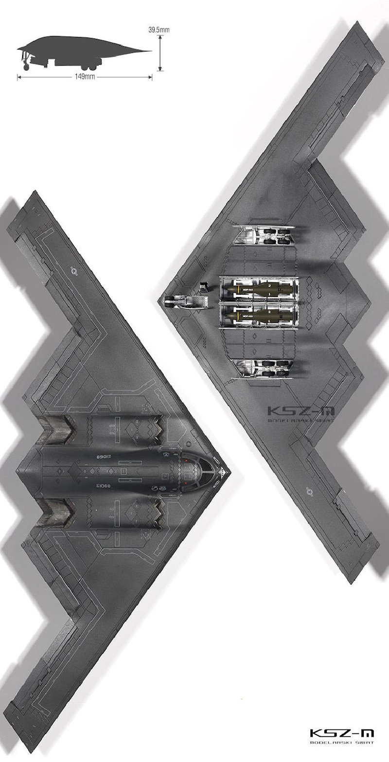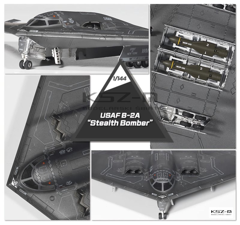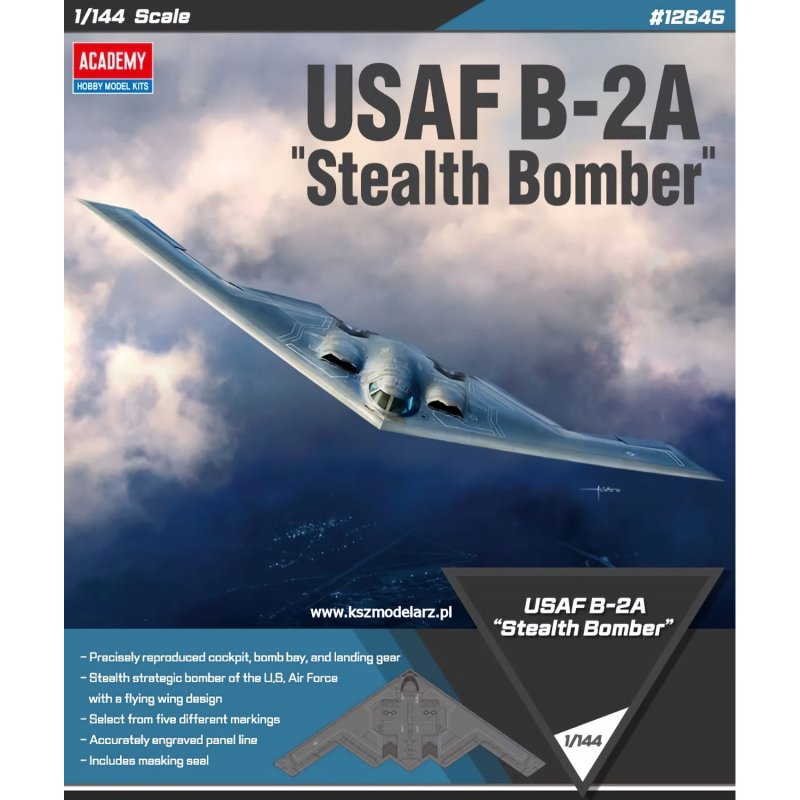 Model przedstawia amerykański bombowiec strategiczny B-2A Spirit, znany również jako „Stealth Bomber”. Wydanie Academy w skali 1:144 wiernie odwzorowuje sylwetkę samolotu o unikalnej konstrukcji latającego skrzydła i obejmuje pięć wariantów oznaczeń.