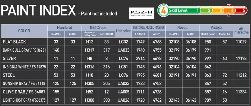 - Zestaw zawiera: wypraski, kalkomanie z pięcioma wariantami oznaczeń, maski do szyb, instrukcję montażu, schemat malowania