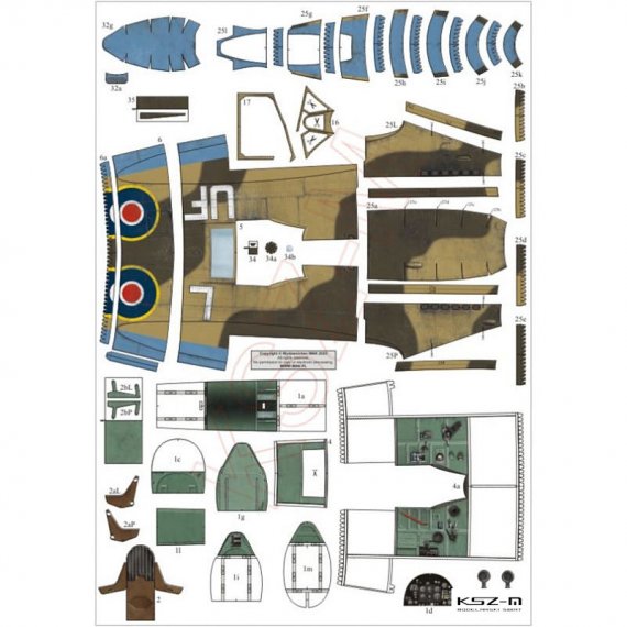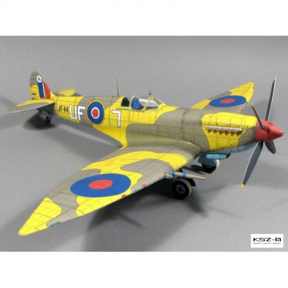 Brytyjski samolot myśliwski Supermarine Spitfire HF Mk.VIII. Malowanie z 601. Dywizjonu Myśliwskiego z czerwca 1943 (kpt. Stanisław Skalski - 18 11/12 zestrzelenia). Model prosty, przeznaczony także dla początkujących modelarzy.