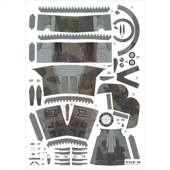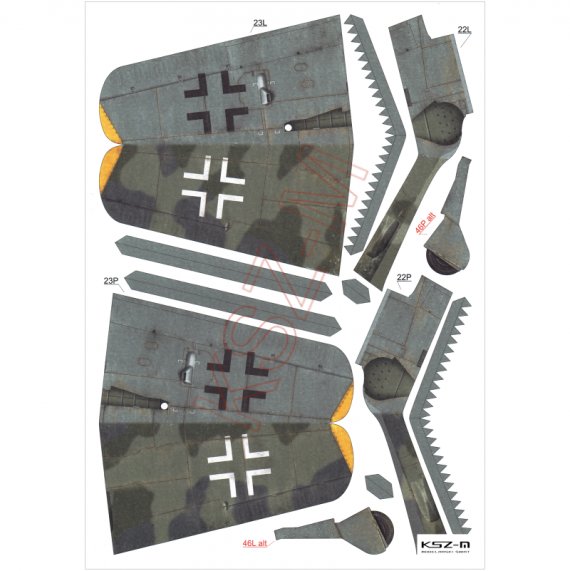 Niemiecki samolot myśliwsko-bombowy FW-190F-8 w malowaniu niemieckiego III./SG3 dywizjonu myśliwsko-bombowego z wiosny 1945 roku. Model prosty, przeznaczony także dla początkujących modelarzy.