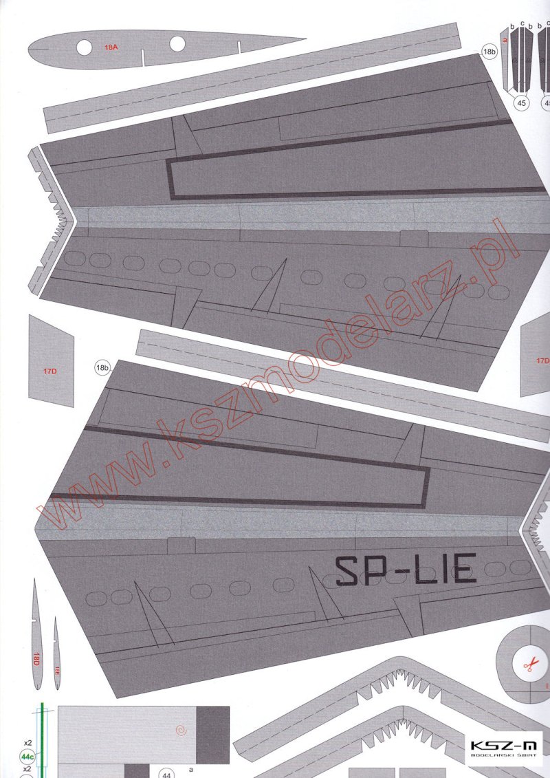 - Wymiary modelu po sklejeniu: rozpiętość 52 cm, długość 63 cm