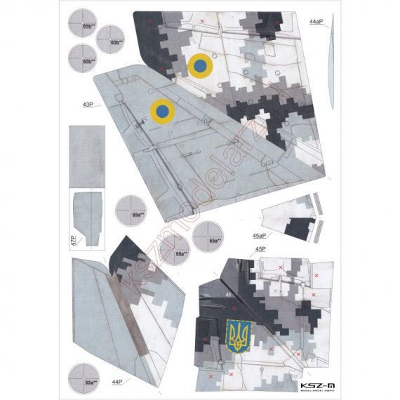 Model ukraińskiego samolotu myśliwskiego w malowaniu 204. Brygady Lotnictwa Taktycznego (2022). Samolot w kamuflażu "pikselowym". Model średnio skomplikowany.