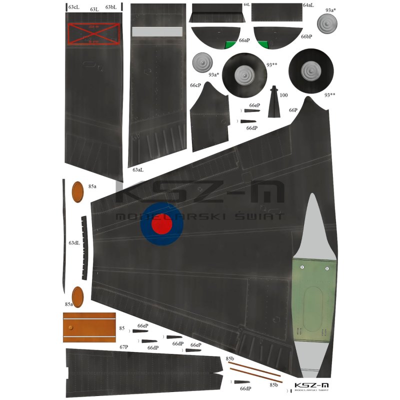 - Detale: dokładne odwzorowanie konstrukcji kadłuba i skrzydeł, wnętrze kabiny, podwozie, uzbrojenie oraz oznaczenia RAF