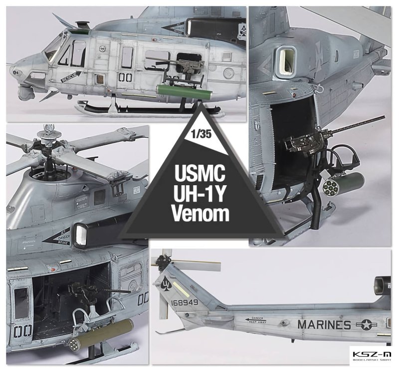 Model przedstawia amerykański śmigłowiec wielozadaniowy Bell UH-1Y Venom używany przez Korpus Piechoty Morskiej USA (USMC). Zestaw w skali 1:35 odwzorowuje nowoczesną wersję rozwojową rodziny UH-1, wyposażoną w czterołopatowy wirnik oraz zmodyfikowaną awionikę. Model wyróżnia się bogatym wyposażeniem pokładowym oraz możliwością prezentacji wnętrza przez otwarte drzwi boczne. W zestawie znajdują się również elementy fototrawione oraz maski ułatwiające malowanie oszklenia.