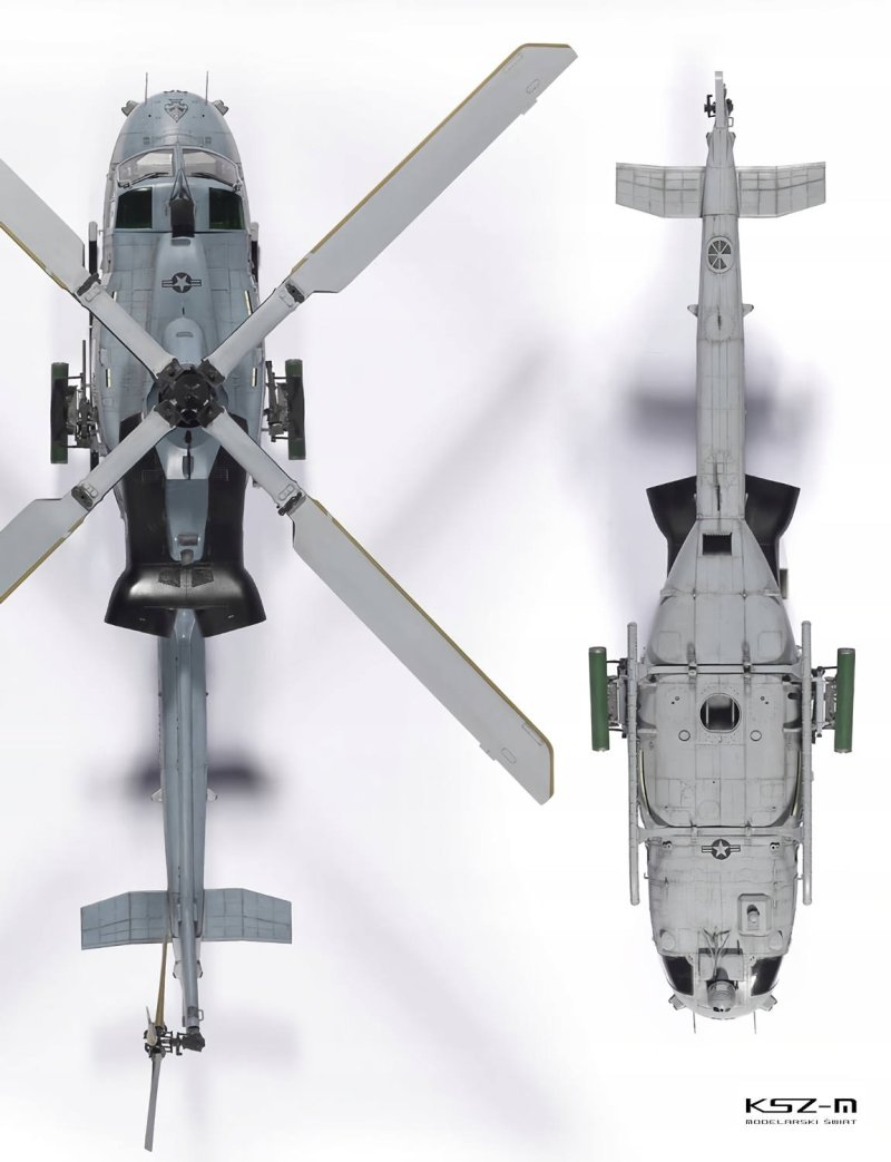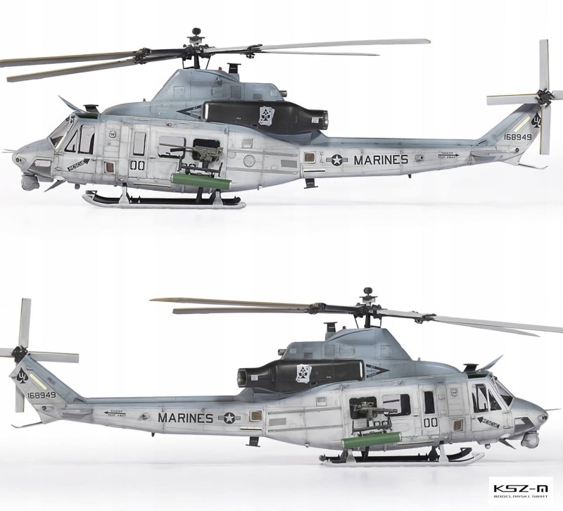 - Detale: szczegółowo odwzorowany kokpit i kabina transportowa, uzbrojenie boczne (GAU-16 / GAU-17), wyrzutnie rakiet LAU-68, możliwość wykonania otwartych drzwi, składany wirnik główny
