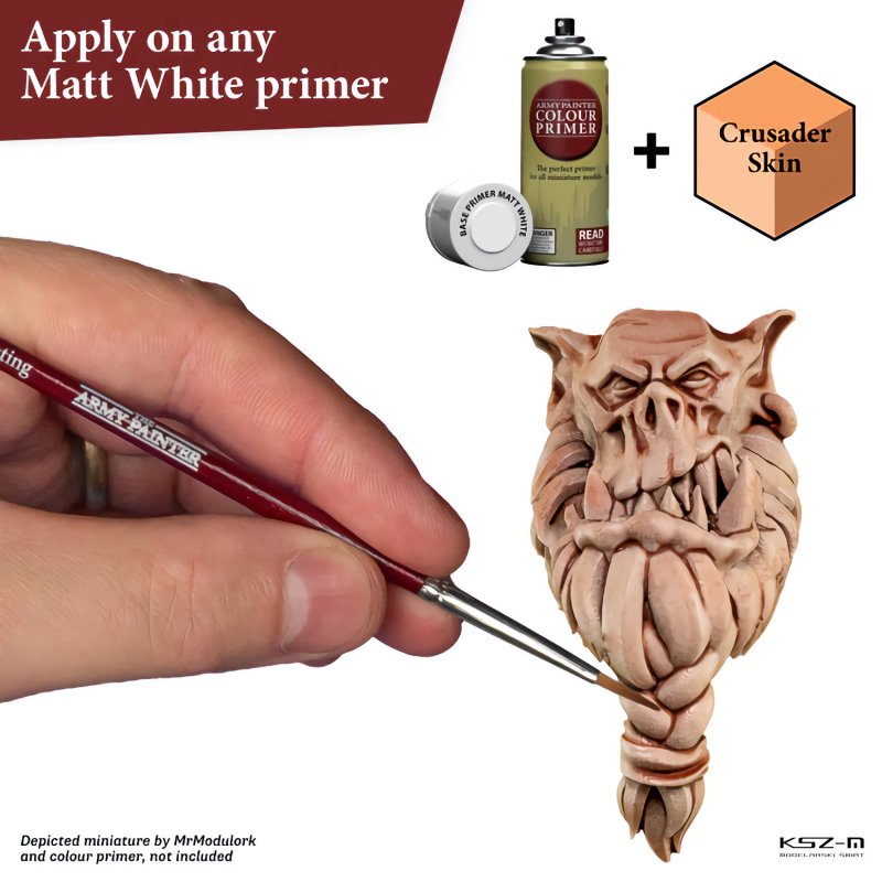 Odcień Crusader Skin sprawdza się przy malowaniu skóry postaci ludzkich, zarówno w modelach historycznych, jak i figurkach fantasy. Może być stosowany do twarzy, rąk oraz innych odsłoniętych partii ciała. Dobrze nadaje się jako bazowy kolor karnacji, który można dalej rozwijać dodatkowymi warstwami lub rozjaśnieniami. Najlepszy efekt uzyskuje się na jasnym podkładzie.