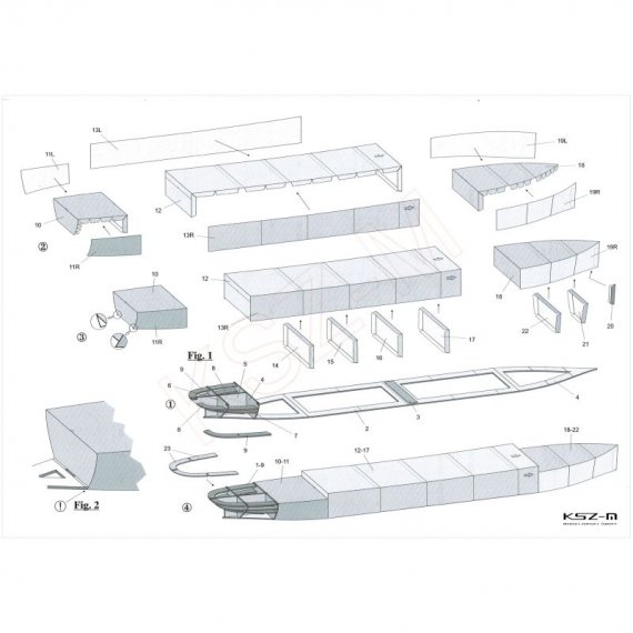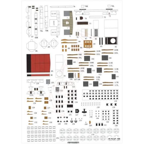 - Model zawiera laserowo wyciętą wodnicę, elementy szkieletu rufy i wsporniki pokładów