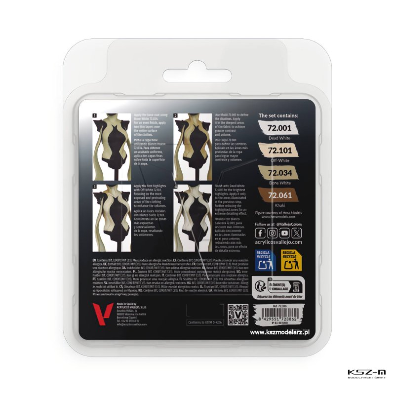 Zestaw został opracowany z myślą o realistycznym odwzorowaniu bieli, która w modelarstwie wymaga odpowiedniego zróżnicowania tonalnego. Zamiast jednego koloru użytkownik otrzymuje zestaw odcieni pozwalających na budowanie pełnego zakresu światłocienia – od cieni, przez kolor bazowy, aż po intensywne rozjaśnienia.