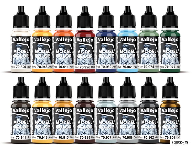 Zawartość zestawu to 16 farb akrylowych Model Color do malowania modeli, figurek i dioram w buteleczkach o pojemności 18 ml: