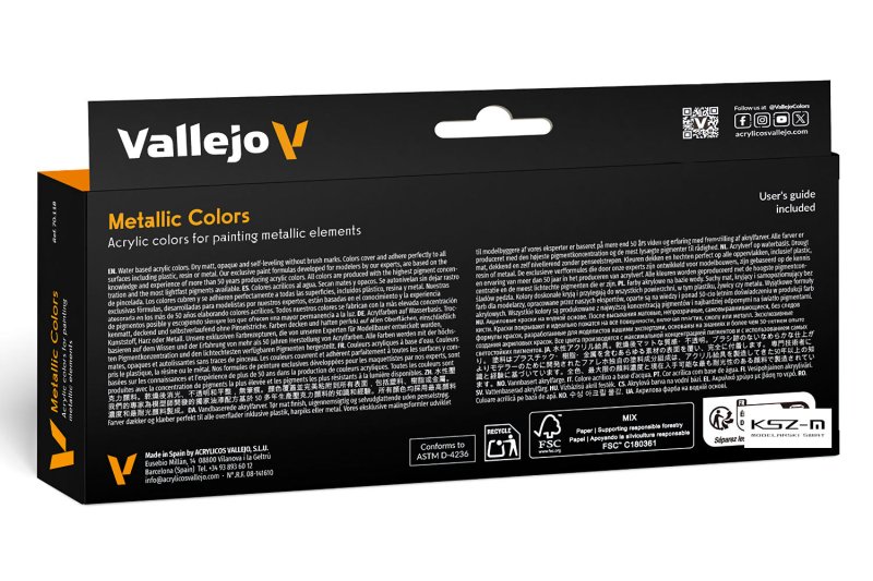 Zestaw Vallejo Metallic Colors 70.118 zawiera osiem farb akrylowych z serii Model Color, idealnych do malowania metalicznych elementów na figurkach i modelach, takich jak zbroje, broń czy detale mechaniczne. Farby obejmują szeroki wybór odcieni, m.in. Silver, Gold, Copper, czy Gunmetal Blue, pozwalając na różnorodne efekty.