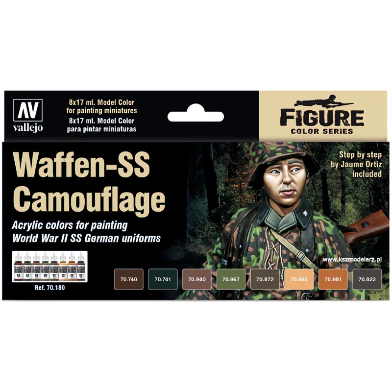 Zestaw farb dobrany do pomalowania trzech wariantów kamuflażu mundurów jednostek niemieckich Waffen SS oraz kolory potrzebne do ich cieniowania. Do zestawu dołączona jest instrukcja malowania krok po kroku autorstwa Jaume Ortiza.