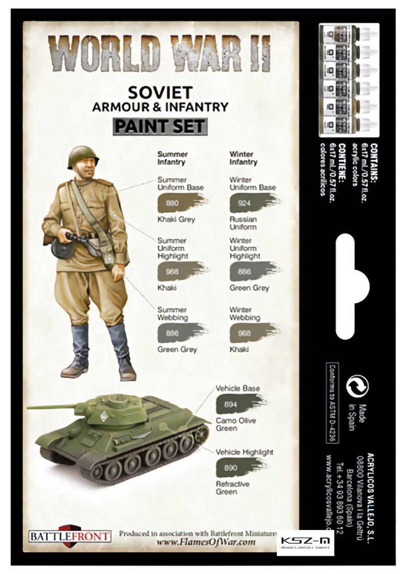 Zestaw farb z kolorami, które były używane do malowania pojazdów i piechoty wojsk radzieckich z czasów II Wojny Światowej. Zestaw pozwala również na pomalowanie jednostek używanych bezpośrednio po II Wojnie Światowej np. czołgu T-64, czy śmigłowca Mi-24 Hind.