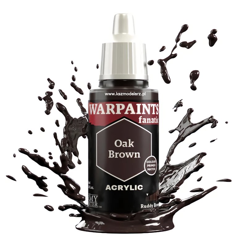 Odcień Oak Brown to głęboki, ciepły brąz o matowym wykończeniu z serii Warpaints Fanatic firmy Army Painter. Kolor ten dobrze sprawdza się przy malowaniu elementów drewnianych, skórzanych oraz detali wyposażenia w modelach i figurkach. Może być stosowany także jako kolor bazowy dla powierzchni w odcieniach ciemnego drewna oraz naturalnych materiałów.