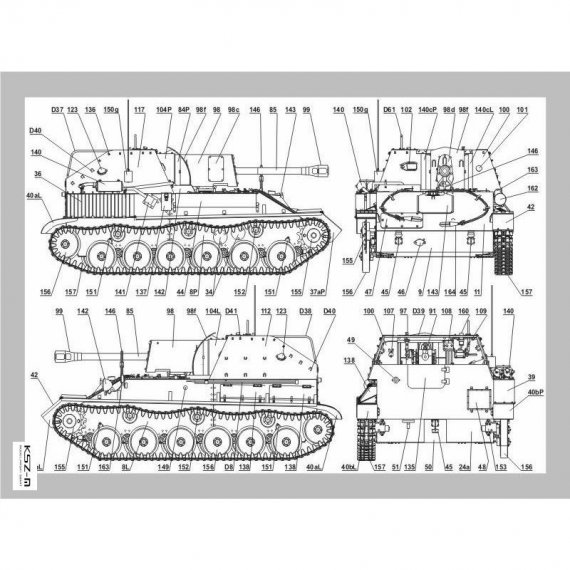 Model radzieckiego działa samobieżnego z II Wojny Światowej. Model w trzech opcjonalnych malowaniach: 2 Dywizja Wojska Polskiego (1944), 1 Korpus Pancerny Wojska Polskiego (1945) oraz radzieckiego 1238 pułku artylerii samobieżnej (1945). Model trudny z otwartym przedziałem załogi, z dwoma wersjami gąsienic (paski i pojedyncze ogniwa).