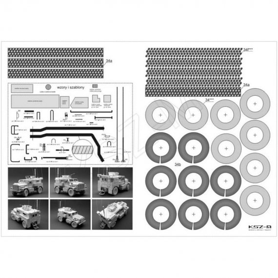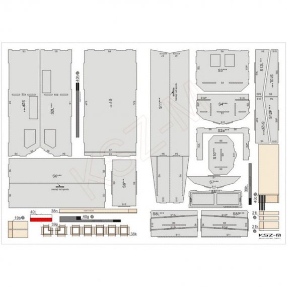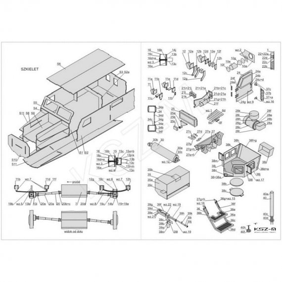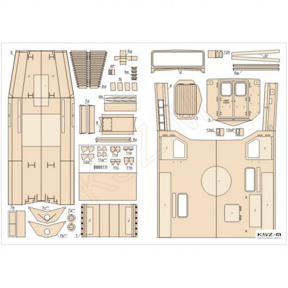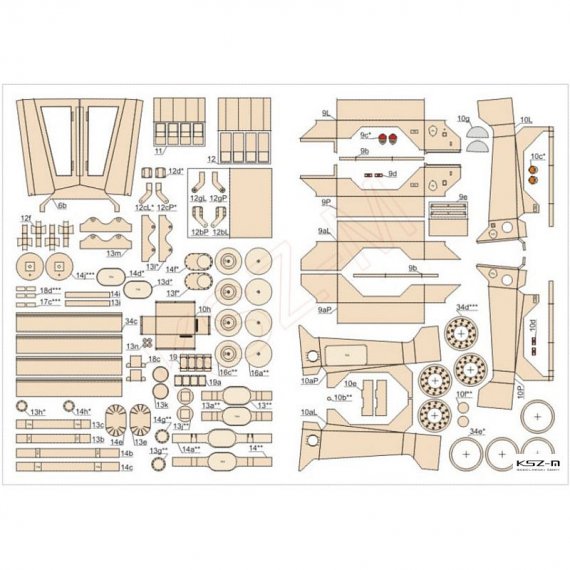 - zestaw wycinany laserowo: wręgi, koła, kostki bieżników opon, grawerowane imitacje płyt z blachy ryflowanej