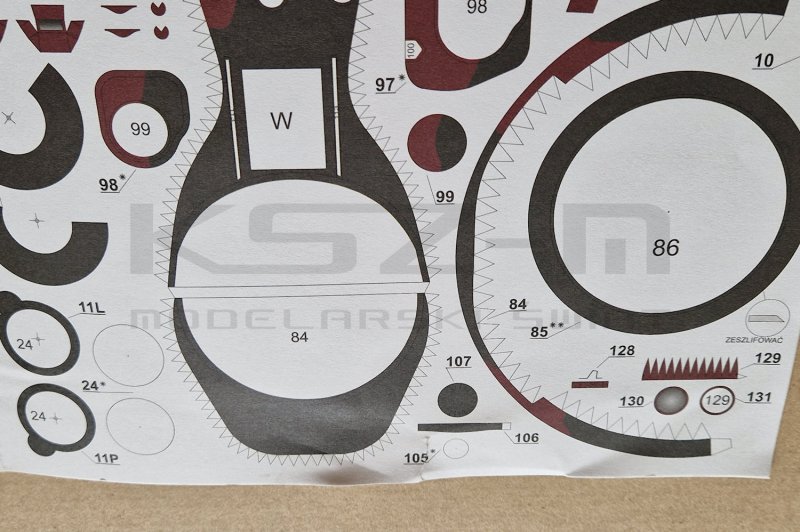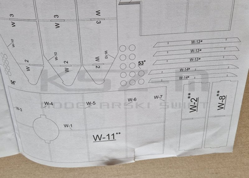 - karton z modelem: dobry-, zagięty bok - bez wpływu na sklejany model, zagięcia/rozerwanie w dolnej części, uszkodzone elementy modelu - patrz zdjęcia