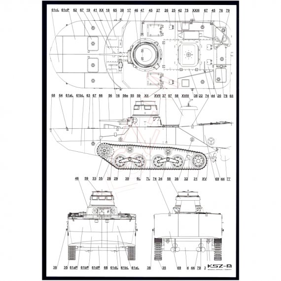 Model przedstawia najpopularniejszy japoński czołg pływający, Type 2 Ka-Mi w malowaniu Specjalnych Sił Desantowych Marynarki Atol Kwajalein 1944 rok. Model można zbudować w trzech konfiguracjach: bez pływaków, ze zdejmowanymi pływakami oraz z zamontowanymi na stałe. Model zawiera także instrukcję w języku angielskim.