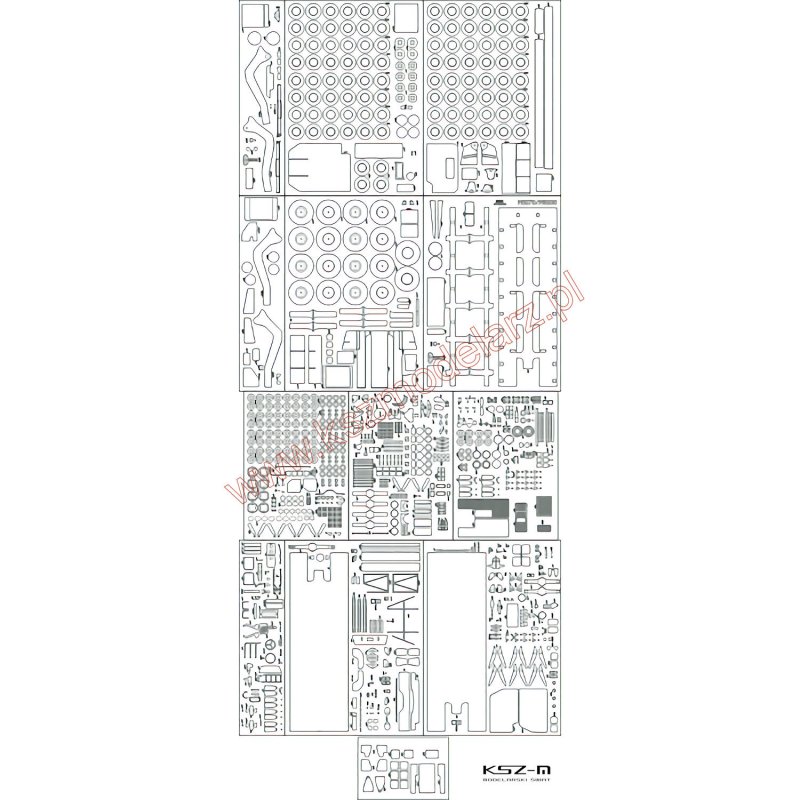Oprócz szkieletu, zestaw zawiera również detale trudne do ręcznego wycięcia – drobne elementy konstrukcyjne oraz wyposażenia. Laserowa technologia gwarantuje ich wysoką precyzję i estetykę. Wszystkie części są gotowe do użycia – wystarczy je delikatnie wypchnąć z arkusza, ponieważ są połączone jedynie cienkimi łącznikami.